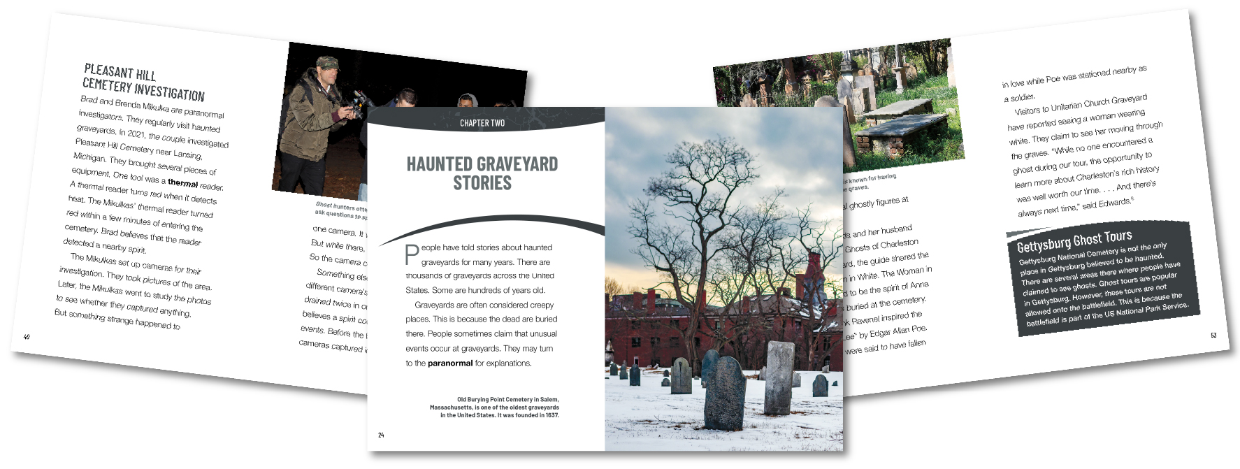 Hi-Lo YA nonfiction. Haunted Places explores different locations that are believed to be haunted, including asylums and hospitals, graveyards, hotels, houses and mansions, and ships and lighthouses. This series examines what makes these places appear to be haunted and highlights the experiences that everyday people and ghost hunters have had there. Each book includes a graphic that presents key information visually, source notes, and resources to aid in further research.