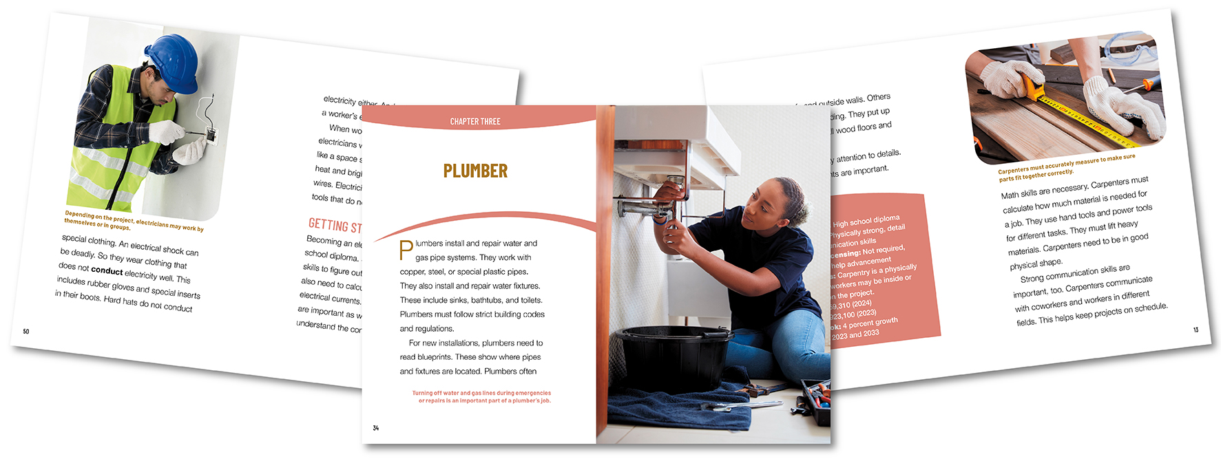 Hi-Lo YA nonfiction. Exploring Exploring Careers Without College provides readers with information about careers that do not require a college degree in five growing industries. This series explores jobs in construction, engineering, health care, technology, and wellness and beauty. The books describe jobs associated with each of these industries and provide information on training, life on the job, and the career outlook. Each book includes graphics that present key information visually, source notes, and resources to aid in further research.